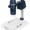 L’ingrandimento è regolabile e varia da 20x a 300x. La messa a fuoco è manuale in un intervallo tra 5 a 80 mm. Il microscopio presenta 8 luci a LED attorno all’obiettivo della fotocamera. La fotocamera è usata come unica lente obiettivo ed è responsabile della riproduzione dell’immagine. Il suo sensore da 0,3 MP (fino a 2 MP grazie all’interpolazione) riproduce un’immagine nitida e dettagliata dei campioni osservati; è possibile compiere osservazioni in tempo reale e, se necessario, salvare foto e video su una scheda di memoria (inclusa). Lo speciale software (incluso) consente di misurare le dimensioni lineari e angolari dei campioni.