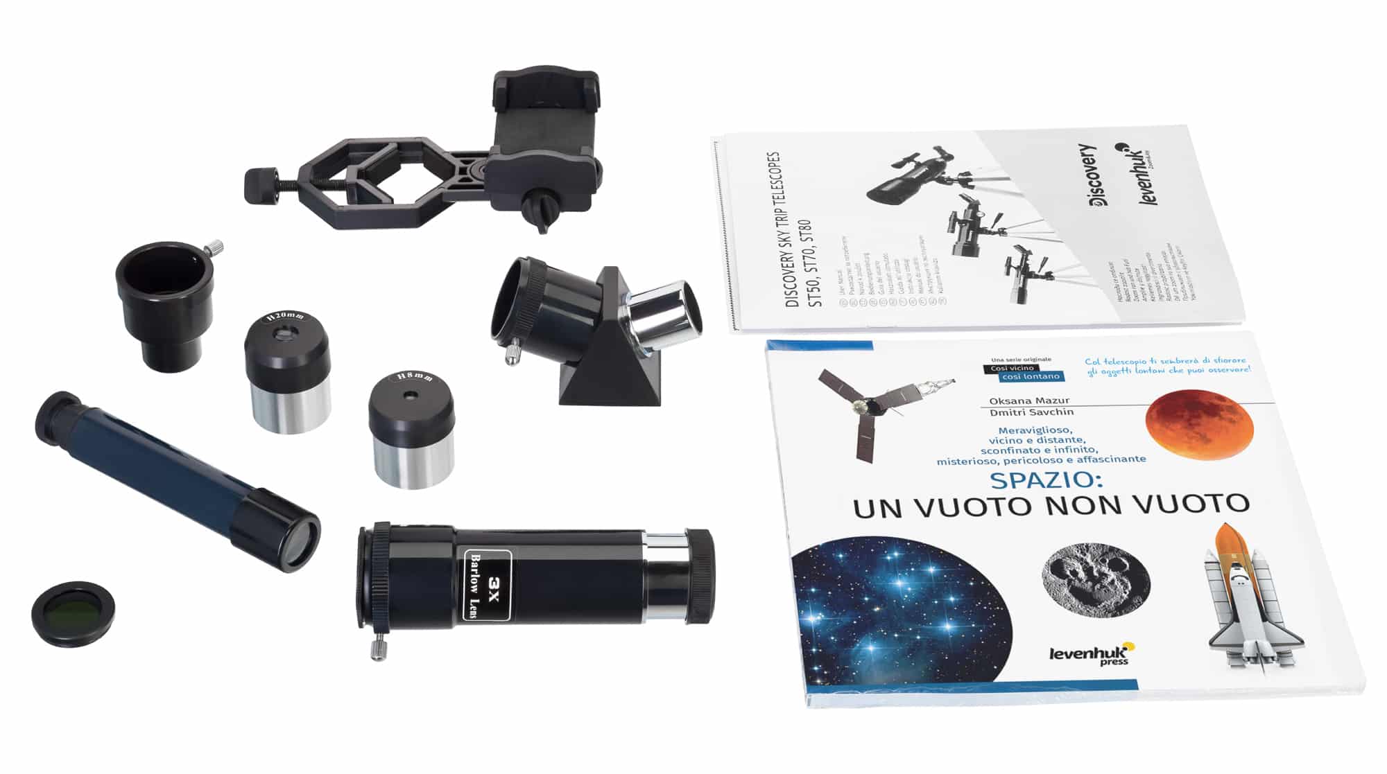 Il telescopio Discovery Sky Trip ST50 è venduto accompagnato da molti accessori e dal libro educativo “Spazio. Vuoto non-vuoto”. I principianti potranno scoprire affascinanti informazioni sull’osservazione delle stelle e mettere subito in pratica le nozioni acquisite. Gli oculari di varie lunghezze focali e la lente di Barlow consentono di sperimentare con i fattori di ingrandimento, mentre il cercatore ottico permette di individuare correttamente degli oggetti specifici nella volta celeste. Il treppiede regolabile si adatta all’altezza dell’osservatore.