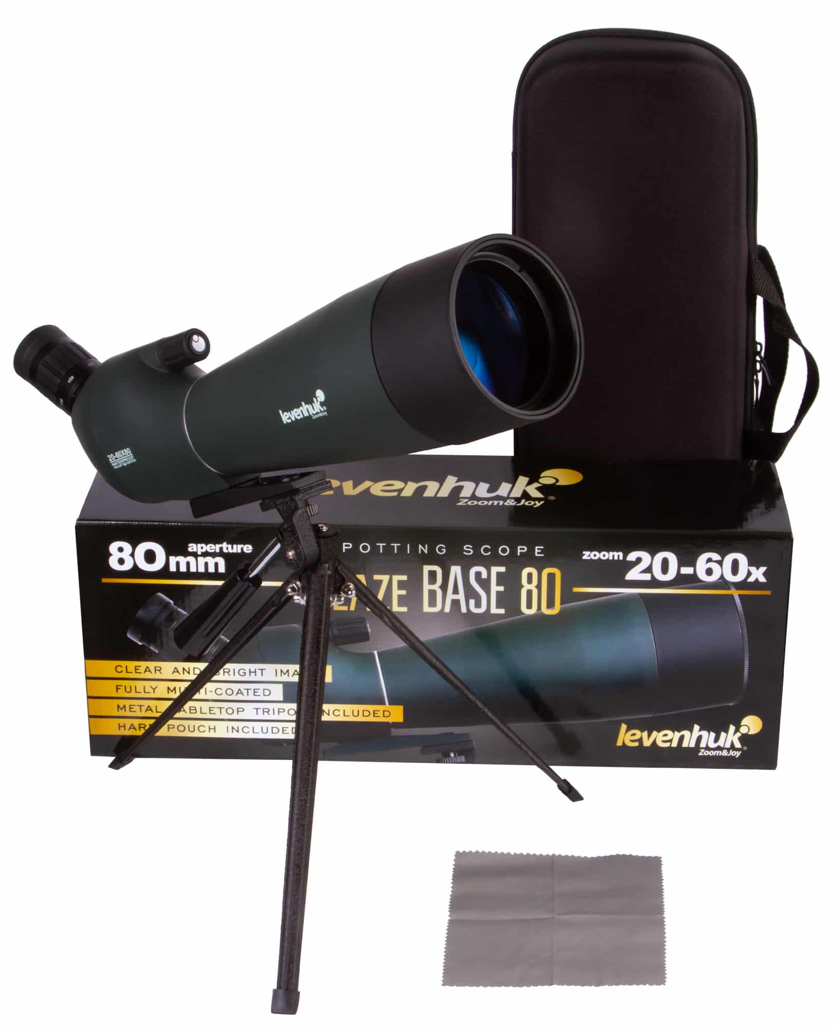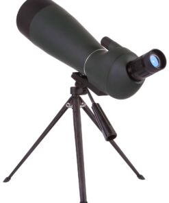 Il Levenhuk Blaze BASE 80 ha un corpo in plastica. Si adatta a ogni treppiede standard con filetto da 1/4″. Il kit comprende un treppiede in metallo per il posizionamento del cannocchiale su un piano d’appoggio, come un davanzale o un tavolo. La custodia rigida inclusa può essere usata per la protezione e il trasporto.