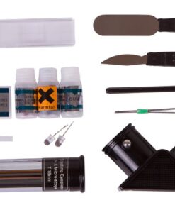 Il kit comprende tutto il necessario per far funzionare il microscopio, oltre a un ampio set di vetrini pronti all’uso e agli strumenti utili per la preparazione di nuovi campioni.