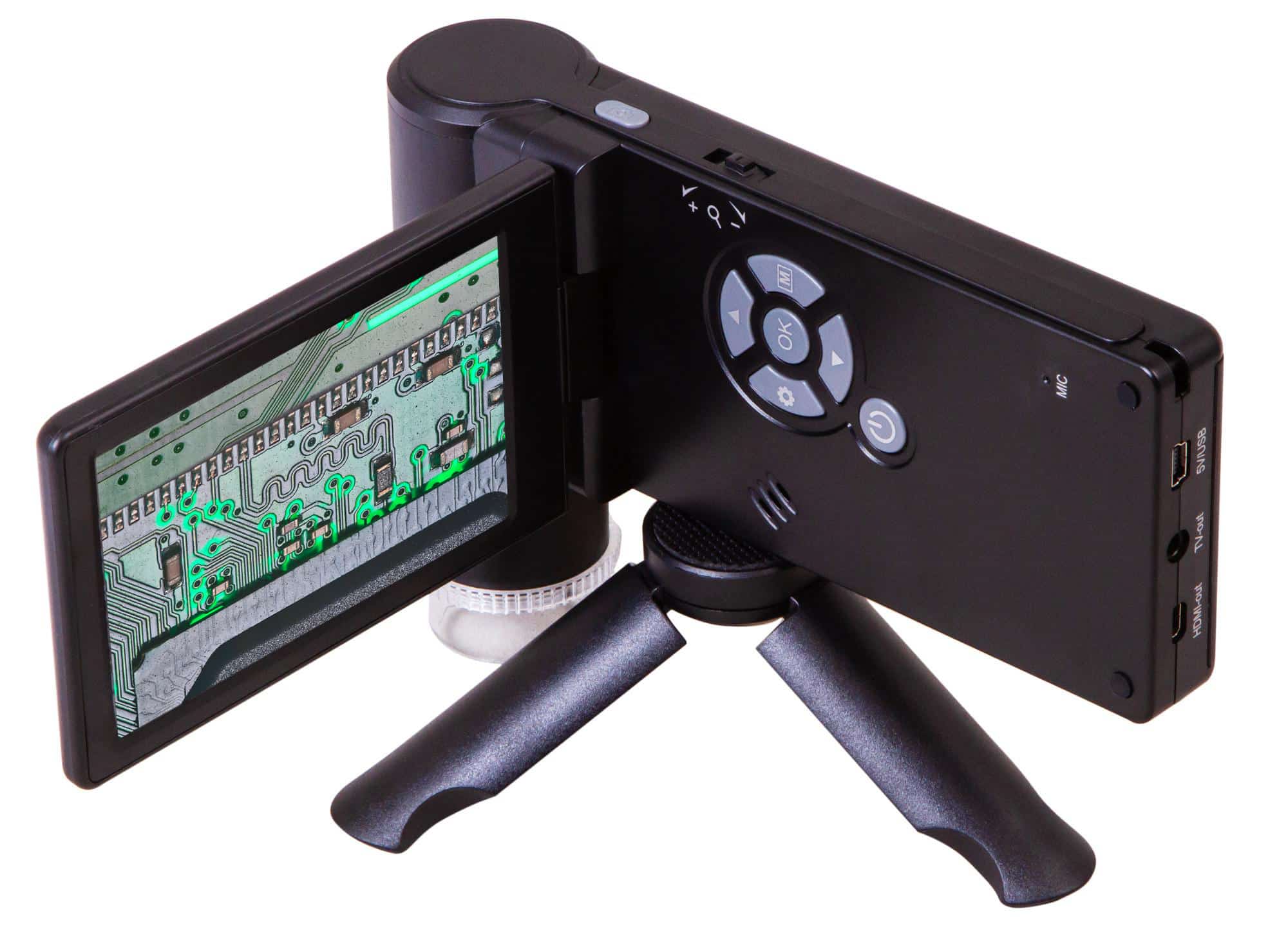 L’immagine è riprodotta tramite una fotocamera digitale con sensore da 5 MP. Essa trasmette un’immagine a colori e ad alta risoluzione allo schermo LCD integrato. Lo schermo orientabile può essere posizionato nella direzione più comoda per l’osservazione durante il lavoro. Inoltre, il microscopio può acquisire immagini e registrare video (è necessaria una scheda di memoria, da acquistare separatamente). Allo scopo, è presente un apposito tasto sul corpo del microscopio. Se necessario, il Levenhuk DTX 700 Mobi può anche essere connesso a un monitor esterno, a una TV o a un computer. Tutti i cavi necessari sono già compresi nel kit.