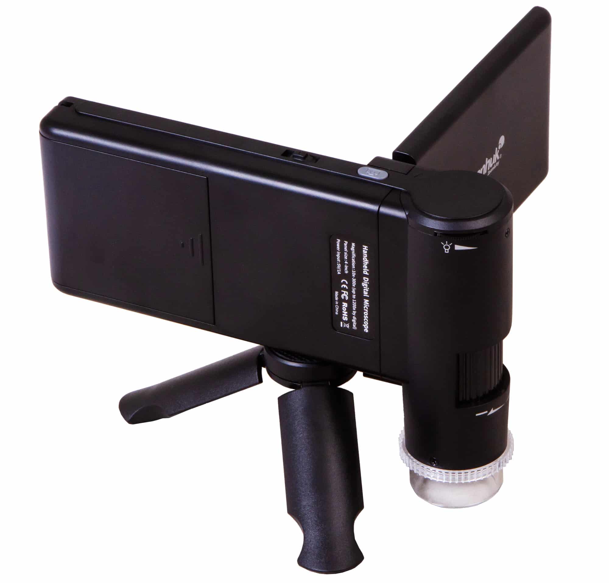 Il microscopio permette di lavorare solo con campioni non trasparenti; delle luci LED a luminosità regolabile sono impiegate come sorgente luminosa. È presente un filtro polarizzatore, che consente di ridurre il bagliore e i riflessi parassiti durante l’osservazione di oggetti con superfici lucide. L’ingrandimento è variabile con continuità in un intervallo compreso tra 10 e 300x, uno zoom digitale consente di raggiungere un ingrandimento di 1200x. Il microscopio è alimentato a batteria (che garantisce 2,5 ore di autonomia) o tramite un alimentatore connesso alla rete AC.