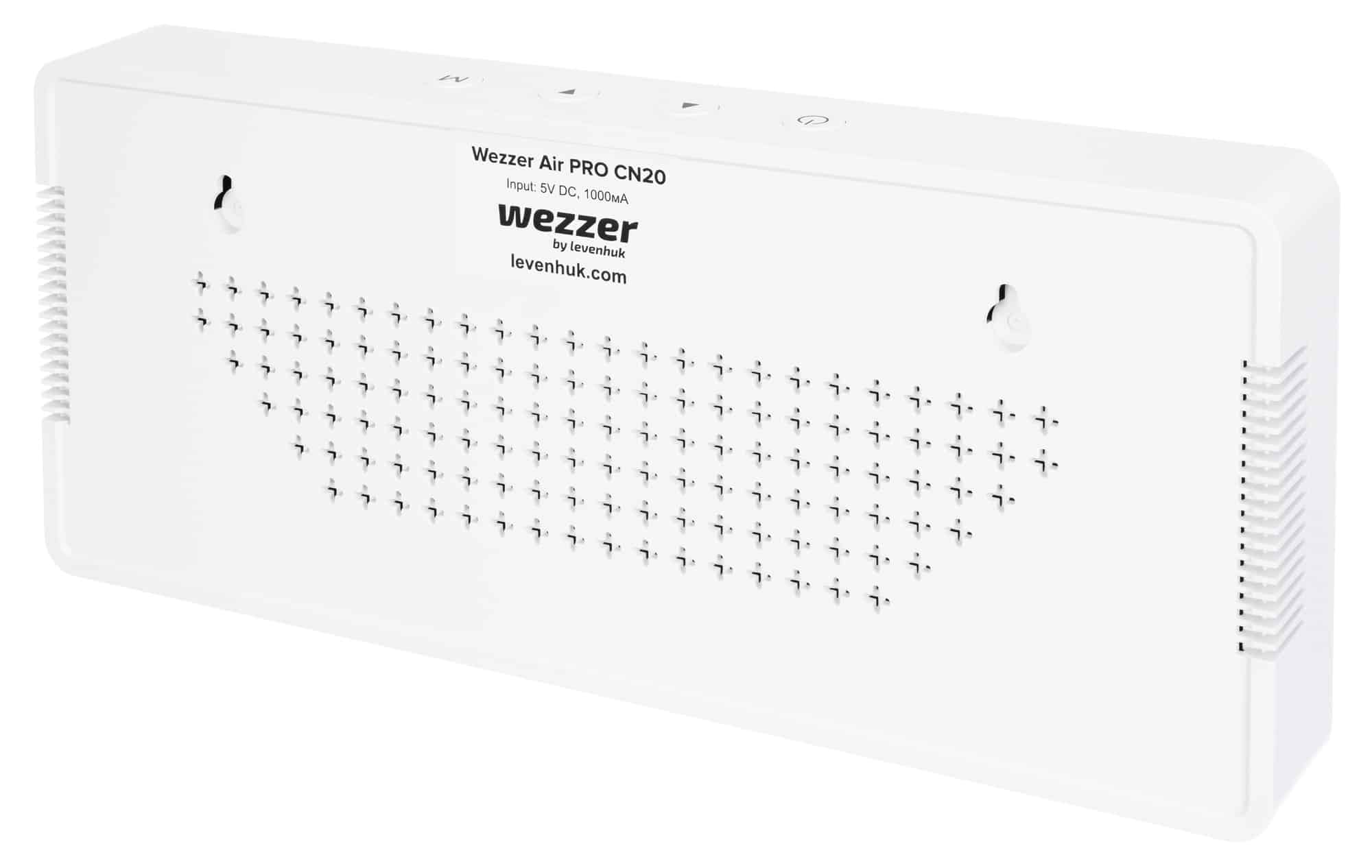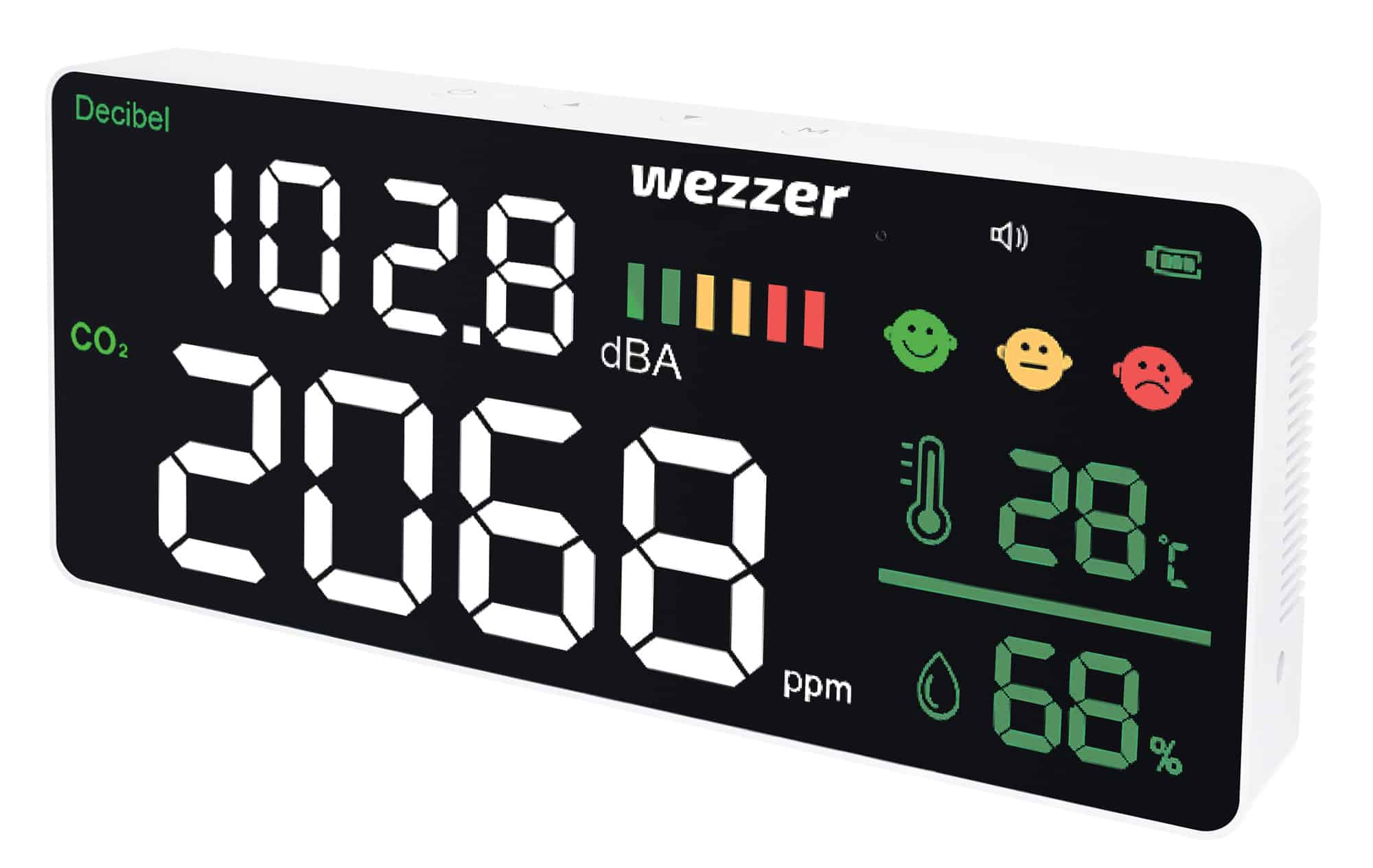 Lo schermo del dispositivo mostra il livello di anidride carbonica misurato in tempo reale. Sono presenti delle icone in verde, giallo e rosso per indicare il livello di comfort del microclima. Quando vengono raggiunti i valori limite, lo strumento avvisa che è ora di arieggiare la stanza. Anche il misuratore di rumore, con il suo indicatore del livello di comfort a colori, è visualizzato sullo schermo. In aggiunta, il Levenhuk Wezzer Air PRO CN20 determina la temperatura e l’umidità dell’aria.