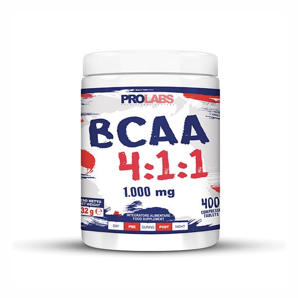 BCAA 4:1:1 è un integratore alimentare di aminoacidi a catena ramificata ottenuti mediante fermentazione, con vitamine B1 e B6. I BCAA sono aminoacidi essenziali, l’organismo infatti non è in grado di sintetizzarli e devono pertanto essere assunti attraverso la dieta. BCAA 4:1:1 è realizzato in compresse da 1000 mg nell’innovativo rapporto 4:1:1 (4 parti di L-Leucina, 1 di L-Valina e 1 di L-Isoleucina). Gli aminoacidi a catena ramificata sono un fondamentale supporto muscolare per gli sportivi. Se assunti prima degli allenamenti hanno funzioni principalmente energetiche ed anticataboliche, fungono da substrato energetico al fine di preservare la massa muscolare dal non essere disgregata a scopo energetico. Se assunti dopo gli allenamenti favoriscono la costruzione e il ripristino della massa magra. La formula infine comprende la vitamina B1 che supporta il normale metabolismo energetico e la vitamina B6 che contribuisce a ridurre stanchezza, affaticamento ed al sostegno del normale metabolismo delle proteine e del glicogeno. Non contiene ingredienti di origine animale ed è adatto anche ai vegani.