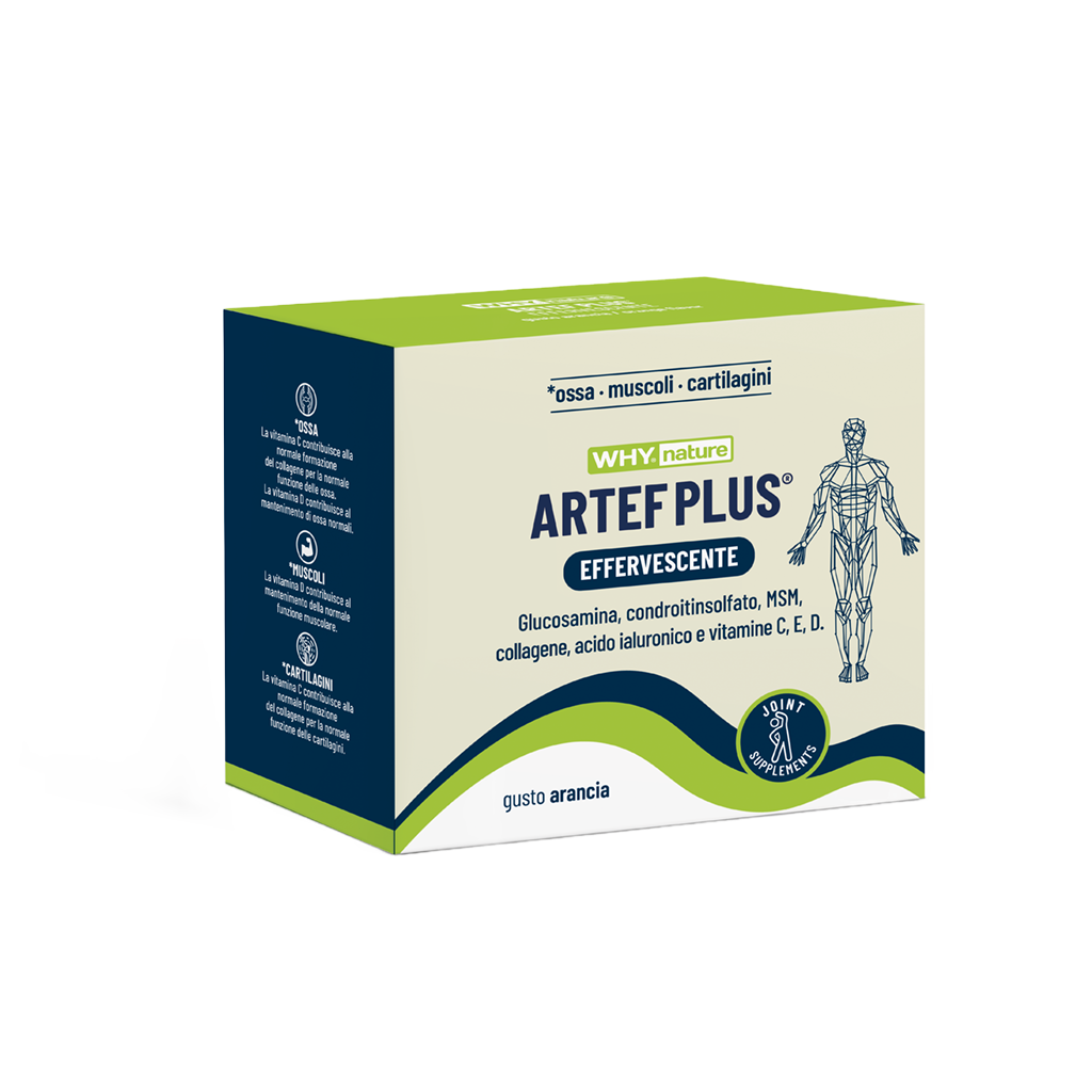Artef® Plus Effervescente combina glucosamina cloridrato, condroitinsolfato,metilsulfonilmetano (MSM), sodio ialuronato, collagene e vitamine C, E e D3, che lavorano in sinergia per il benessere delle articolazioni e concorrono a sostenerne la mobilità e flessibilità. Oltre a glucosamina cloridrato, un amino-zucchero di origine vegetale, ricavato dalla fermentazione del mais ad opera di Aspergillus niger, Artef® Plus Effervescente di WHYnature contiene anche collagene Cartidyss™, un collagene derivato da pesce idrolizzato di tipo II. La caratteristica di questo collagene è la sua alta biodisponibilità: significa che è maggiormente assorbibile dall’organismo e quindi più efficace e veicolabile per raggiungere il punto di azione.
